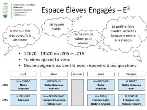 E3 n’est pas obligatoire et ne nécessite aucune inscription. L’élève peut se présenter tous les jours ou selon ses besoins. Pour des raisons d’organisation, une liste de