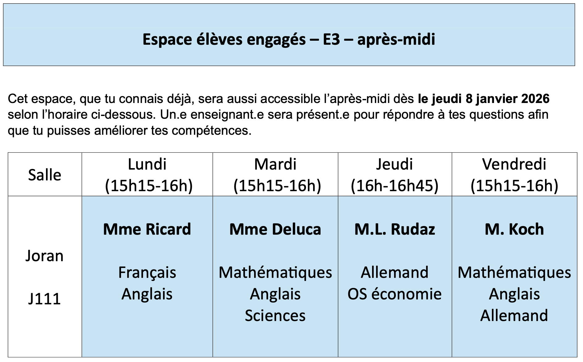 E3 n’est pas obligatoire et ne nécessite aucune inscription. L’élève peut se présenter tous les jours ou selon ses besoins. Pour des raisons d’organisation, une liste de